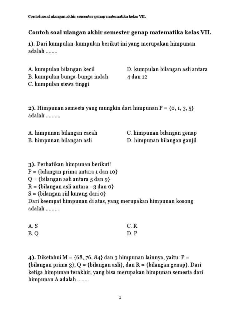 Fatkoer rohman website:2 evaluasi mandiri a. Latihan contoh soal matematika kelas 7 essay. Soal pengayaan uas matematika kelas 7 semester genap 2015 (matematohir.wordpr. Beberapa kumpulan soal uas untuk semua mata pelajaran fisika, matematika, . Perhatikan diagaram venn berikut !